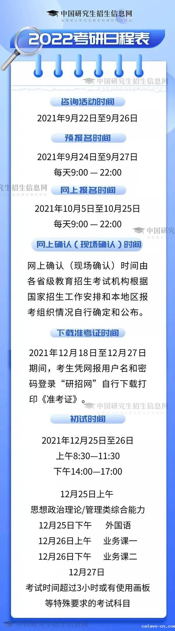 新华网北京9月23日电 根据《2022年全国硕士研究生招生工作管理规定》,2022年研考网上报名时间为2021年10月5日至10月25日。网上预报名时间为2021年9月24日至9月27日。