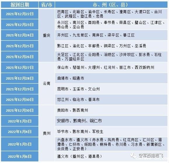根据2022年度空军招飞工作安排,空军招飞局成都选拔中心计划从12月22日开始,组织重庆、云南、贵州部分初选合格考生复选检测(四川省复选检测通知于元旦节后发布),具体事项通知如下: