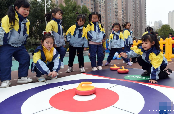 2月16日,合肥市泰山路幼儿园的小朋友在开学典礼上体验“旱地冰壶”游戏。
