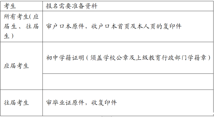 (3)零星往届考生(即已获得初中毕业证)本人持户口册、初中毕业证(所有证件,审原件交复印件)到户籍所在县(区)招办现场报名,并在报名现场进行照片采集。