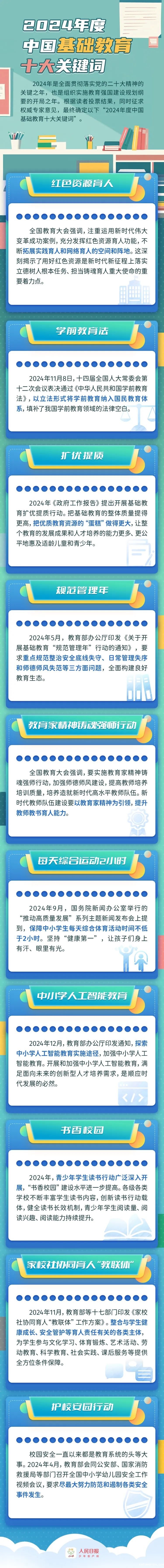 教育兴则国家兴,教育强则国家强。建设教育强国,基点在基础教育。2024年是组织实施教育强国建设规划纲要的开局之年。这一年来,中国基础教育领域在深化综合改革、加快推进高质量发展的道路上奋勇向前,不断增强人民群众的教育获得感、幸福感、安全感,继续答好“强国建设、教育何为”的时代课题。在教育部基础教育司指导下,人民日报少年客户端推出《揭晓!2024年中国基础教育十大关键词》图解,让我们一起关注。