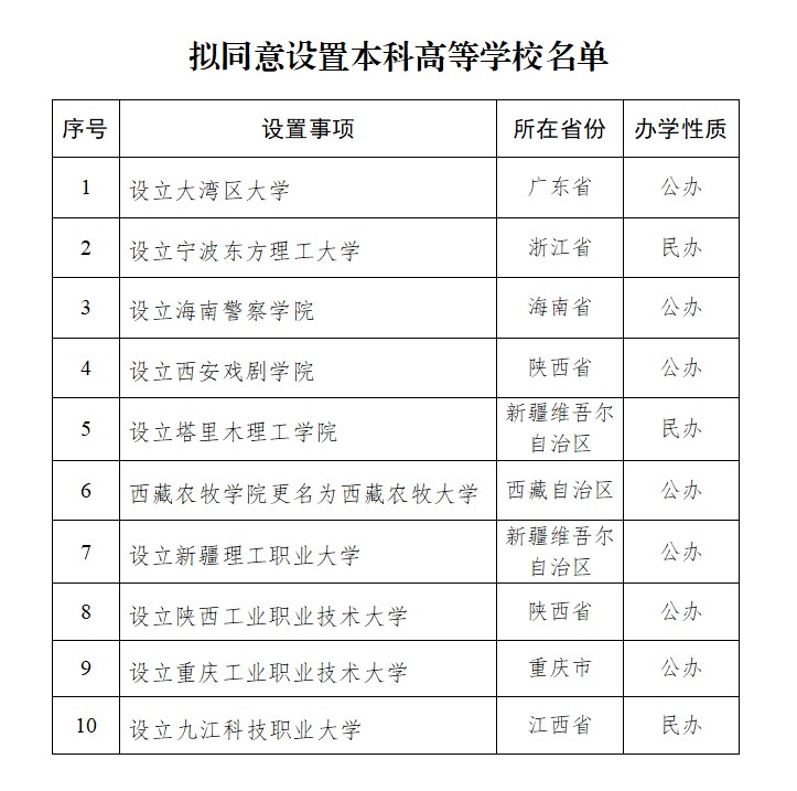 根据《中华人民共和国高等教育法》《普通高等学校设置暂行条例》《普通本科学校设置暂行规定》《本科层次职业学校设置标准(试行)》等有关规定以及第八届全国高等学校设置评议委员会考察评议结果,经教育部党组会议审议,拟同意设置大湾区大学等10所学校,现予公示。