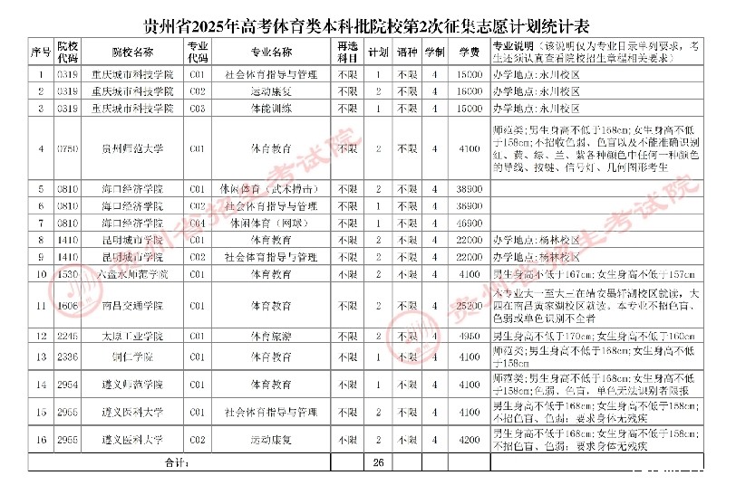 附件:贵州省2025年高考体育类本科批院校第2次征集志愿计划统计表