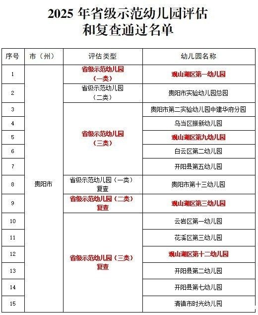 近日,贵州省教育厅公布了《省教育厅关于公布贵州省学前教育保障机制试点项目县和省级示范幼儿园评估结果的通知》,观山湖区第一幼儿园荣获省级示范一类园认定,观山湖区第九幼儿园荣获省级示范三类园认定,另有观山湖区第三幼儿园(省级示范二类园)和观山湖区第十二幼儿园(省级示范三类园)顺利通过复查。