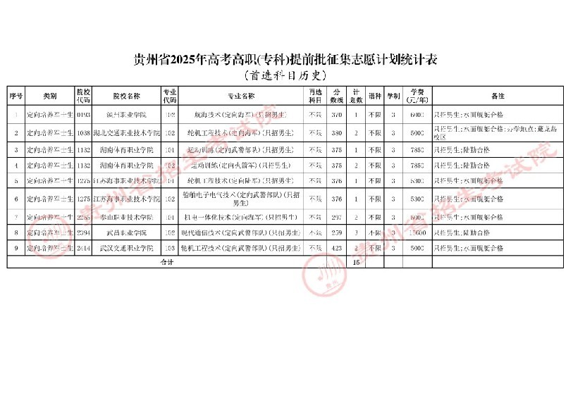 2.贵州省2025年高考高职(专科)提前批征集志愿计划统计表(首选科目历史)